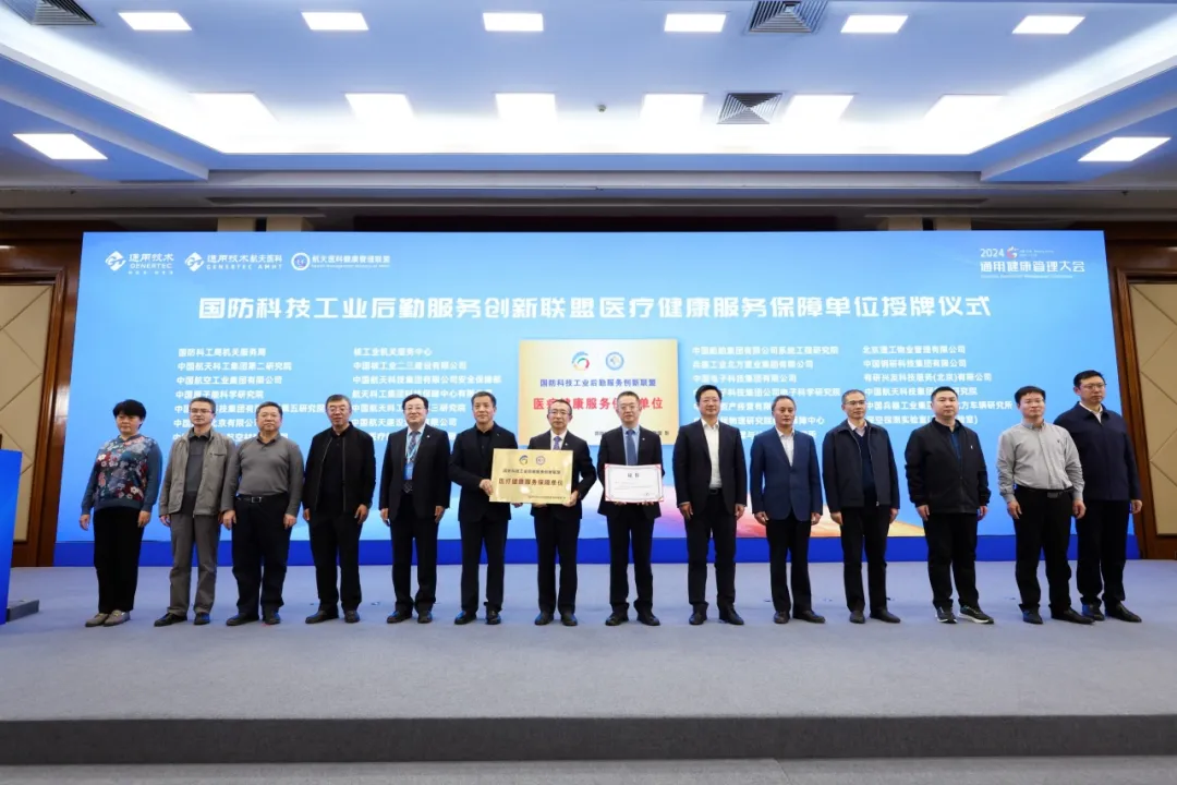 国防科技工业后勤效劳立异联盟理事长宫殿荣、联盟常务副理事长高国军向庄闲和网址技术航天医科所属航天中心医院颁授“国防科技工业后勤效劳立异联盟——医疗健康效劳包管单位”牌匾及证书,联盟部分成员单位领导和代表配合见证授牌仪式。